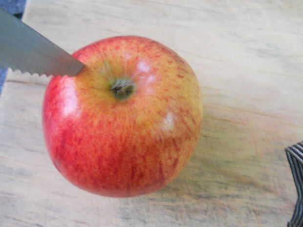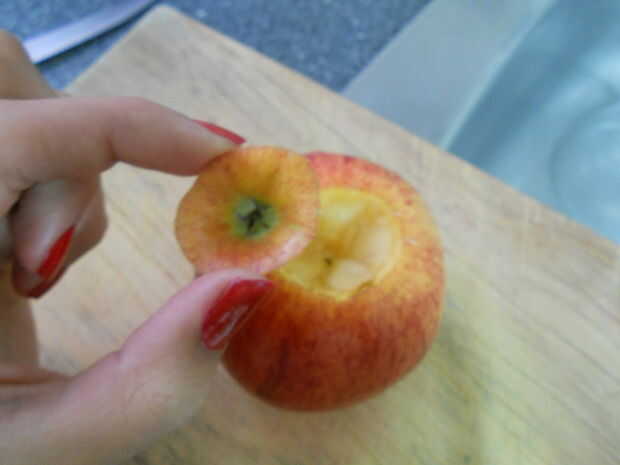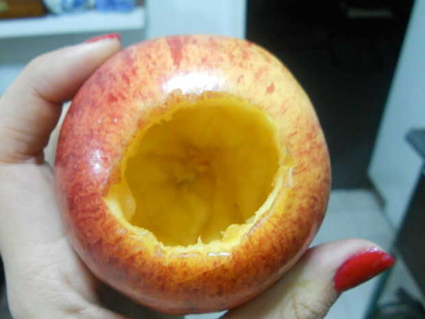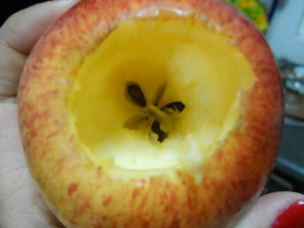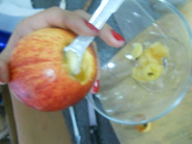 Con la ayuda de la cuchara pequeña recorrer el corazón de la manzana, más por lo que es hueco.