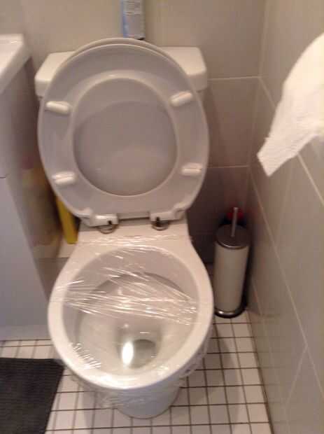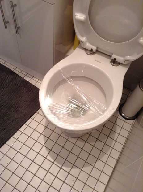 Envolver los dos trozos de film transparente alrededor de la taza del inodoro (Levante el inodoro asiento fuera del camino primero). Intente que sea pegado tan ajustadamente como sea posible. Poner una pieza cerca del frente y otra cerca de la parte posterior para que la cubra por todas partes.