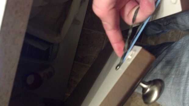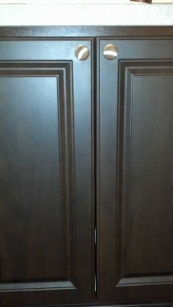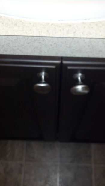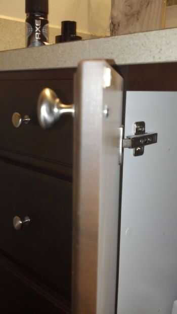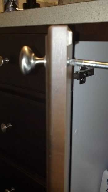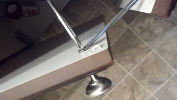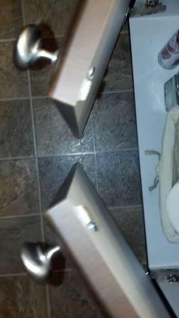 Open up the sink cabinet. Levemente Desenroscar el tornillo de la perilla en cada puerta del mueble hasta hay un pequeño