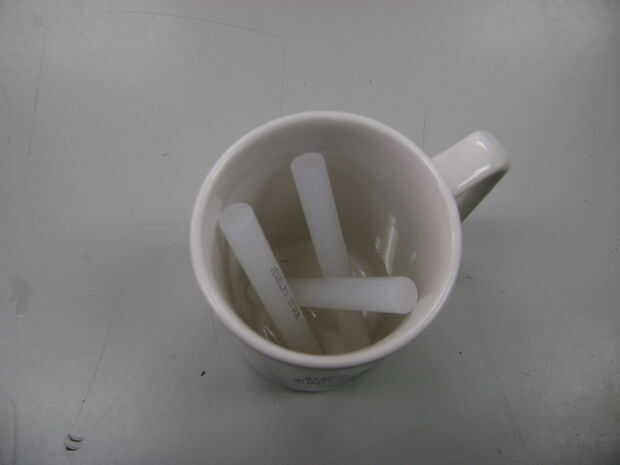 No tiene ningún calendario concreto aquí porque dependiendo de la temperatura que derrite el pegamento, el grueso de la palanca y su potencia de microondas, variarán. Revisé el pegamento de fusión cada minuto que estaba en el micro hasta que era un charco en el fondo de mi copa. Una vez que comienza fusión te puede mezclar o empuje la palanca contra el lado de la taza para más contacto con la cerámica caliente.