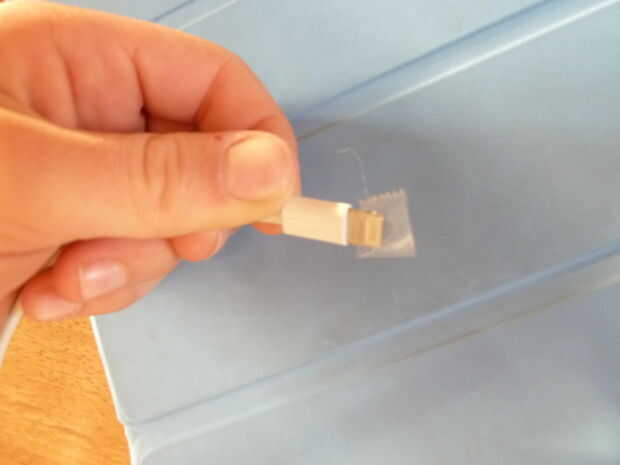 Corte muy pequeño de la cinta, metal lo suficiente para envolver alrededor de la pequeña parte en el cable de conexión. Luego, envuelva la cinta alrededor de la parte metálica y enchúfelo en el Ipad. Si el cable no encaja, entonces corte poco exceso de cinta en el cable. La cinta debe bloquear la conexión para que el Ipad no se carga.