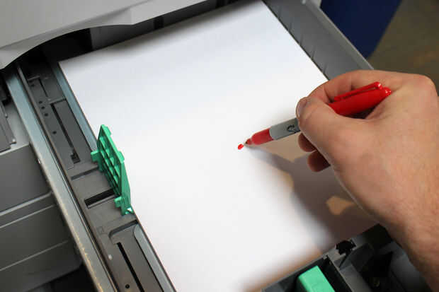 Abrí la bandeja del alimentador y ponga una marca en la hoja superior, entonces cierra la bandeja y funcionó una copia en blanco. Después de examinar el resultado determiné que mi copiadora impreso con la bandeja del alimentador hacia arriba. Me cargan en mi papel de ayudante de broma luego establecer la impresora para alimentarse sólo de la bandeja de papel de broma.