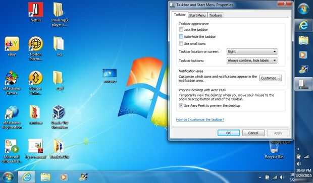 Arrastre la barra de tareas para el lado o la parte superior. Si está bloqueado, haga clic derecho para desbloquearlo. Haga clic con el botón derecho propiedades en la barra de tareas y seleccione Ocultar automáticamente.
