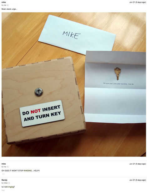 No sé si esto es a causa de los largos inviernos fomentar una fuerte vida interior y la innata curiosidad, o porque medicina socializada los hace sin miedo. O - quizás - ya que todo el mundo ama a los canadienses, sólo asumen que nadie los enviará una caja sellada con una campana que no se apagará. Para todo lo que sé, podría ser algo completamente diferente en el carácter nacional que provoca este fenómeno. No estoy muy seguro de por qué son tan susceptibles al insertar y girar la llave.