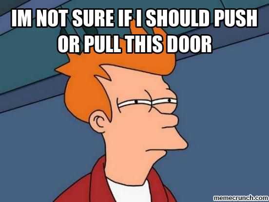 Bueno lo primero una historia rápida. En nuestra Universidad existen dos juegos de puertas donde ambos lados tienen manillones y en cualquier momento del día puedes ir allí y ver la gente el lado del tire y tire del lado de empuje. Me puso a pensar, unos pequeños signos que indican lo que debe hacer solucionaría este problema. Así que decidí hacer lo contrario!