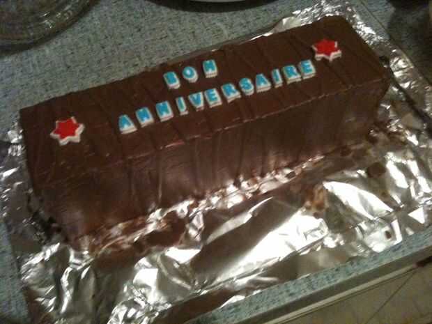 Tomé un pedazo de madera 8cm x8cm y 30 cm de largo y menaje pured sobre él para que se vea como un real chocolatecake... después de eso decorted con azúcar Letras y estrellas... muy simple y hace menos de 10 min