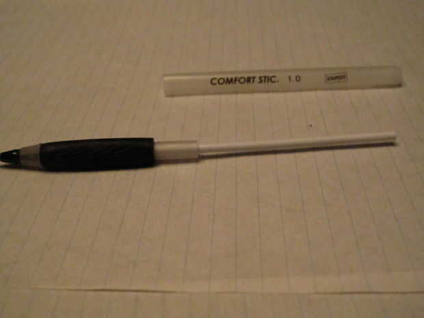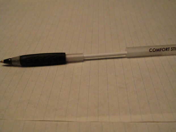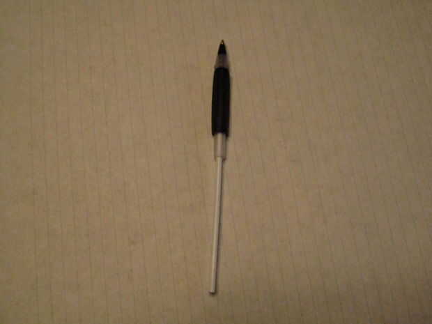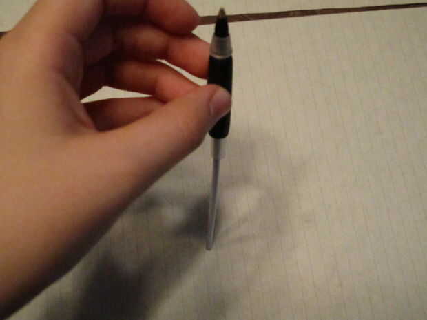 En primer lugar, coge la pluma por la empuñadura de goma y tire de ambas piezas aparte. Luego, sujeta el lápiz por la misma parte, ponga el extremo del tubo de tinta sobre una mesa o algo duro y fuerza por el otro lado. Ahora, debe tener tres partes.