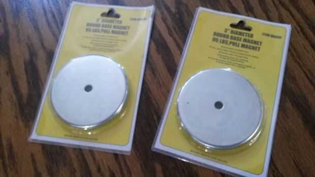 Harbor Freight tiene estos imanes "90 lb Pull" para como $5,99. Creo que la fuerza es exagerada, pero el precio es correcto, así que comprar dos a la vez y hacer clic en ellos juntos. Figura el segundo agrega 50% más de potencia, pero también añade más peso.