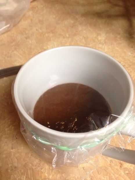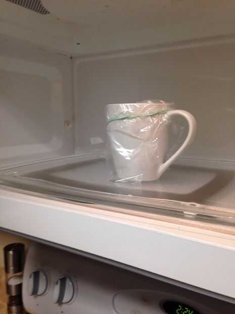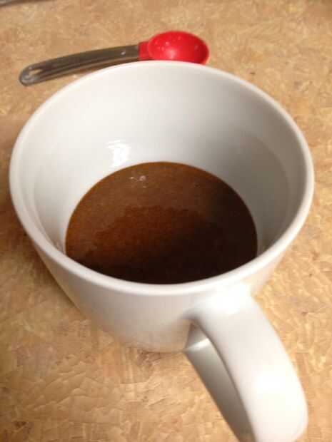 Vierta la mezcla en una taza y poner plástico sobre la parte superior. Cocinar en el horno de microondas por 1:00-1:30 minutos, luego metes en un plato.