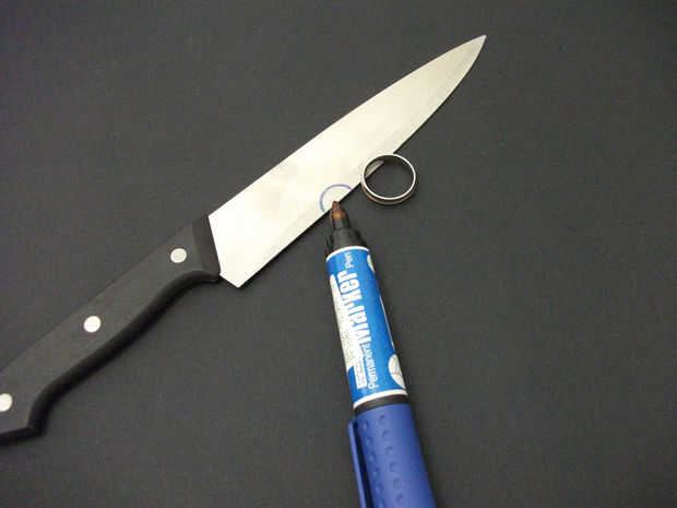 Con el su anillo y el marcador para hacer un círculo de 1/2 en el cuchillo.