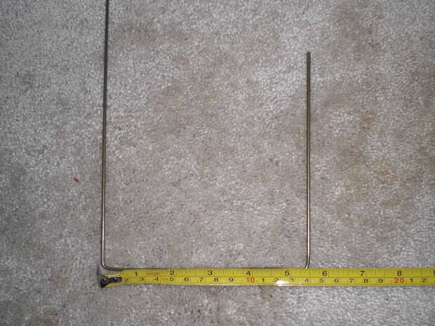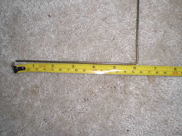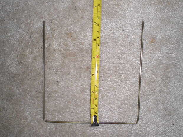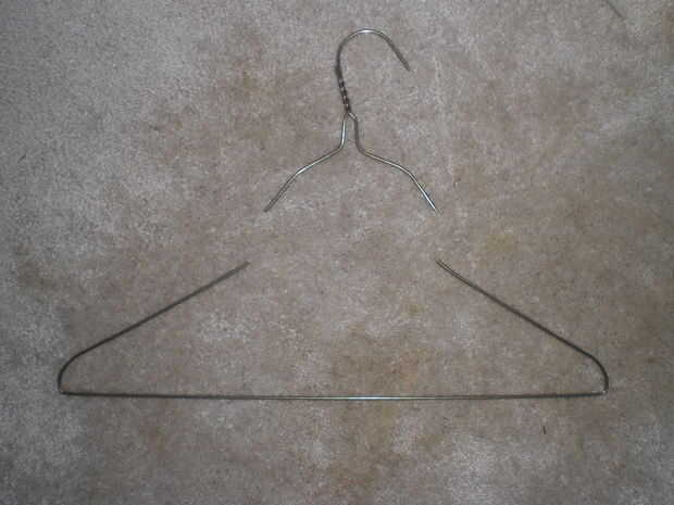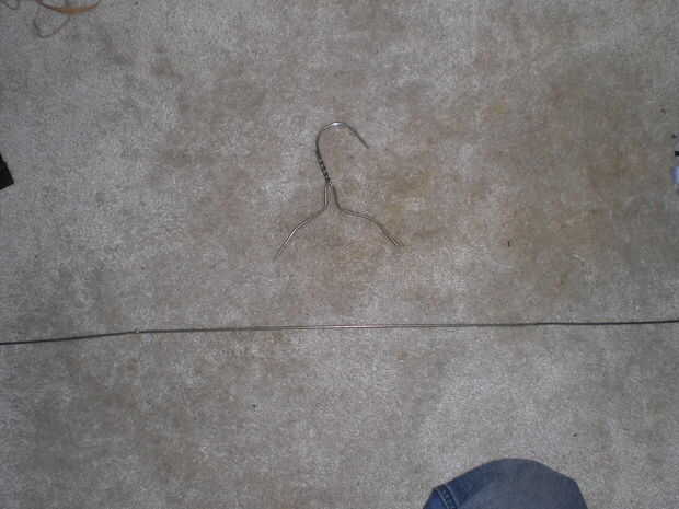 Tomar tu percha y tu sobre cortar la parte superior de la percha y deseche la parte superior. Luego, enderece el gancho.  Ahora doble el soporte en un ángulo de 90 grados, 6 pulgadas hacia abajo. Ahora encontrar el ancho de la envolvente. El mio es 6". Reste medio y pulgadas de eso y tiene la longitud que debe ser el centro de su percha. Después de hacer esta curva a 5.5"(para mí), un ángulo de 90 grados. Ahora tienes un montón de perchas izquierda. Sólo se cortan a 6" de la última curva. Ahora debe tener una "U" en forma de percha.