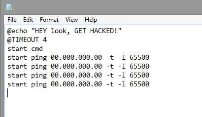 Inicio ping -t [IP] -l [número] = este es el comando que parecerá allí conseguir hackeado. Es el código básico para un ataque DDOS. Si sabes a tus amigos dirección IP puede ponerlo en el lugar de los 0. Si no sólo tiene que utilizar de 0.