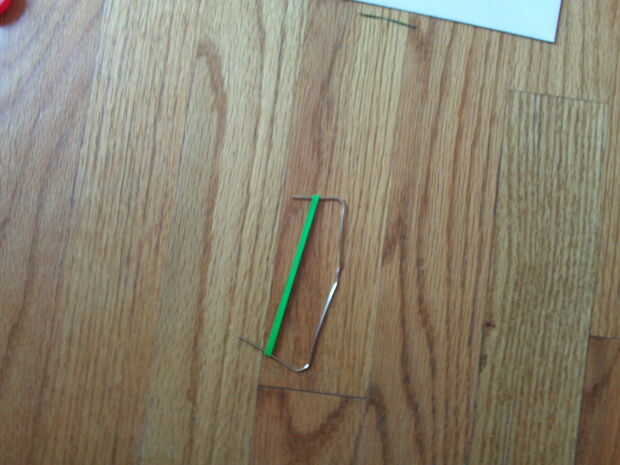 El primer paso es tomar un clip de papel regular y doblarla, en una forma que es un rectángulo, falta uno de sus lados más largos. Después de eso tomar la goma y poner en los extremos del clip de papel, para que pueda mantener apretado y de trabajo.