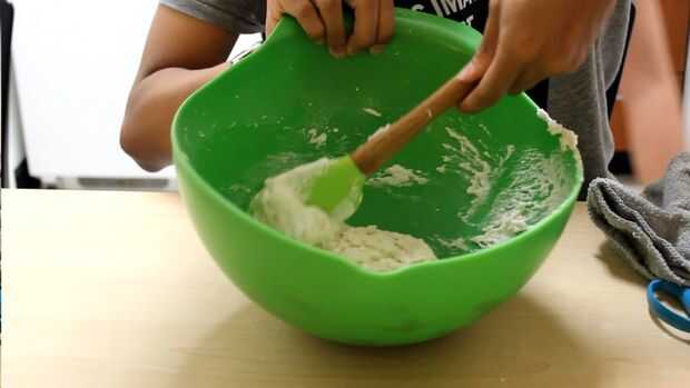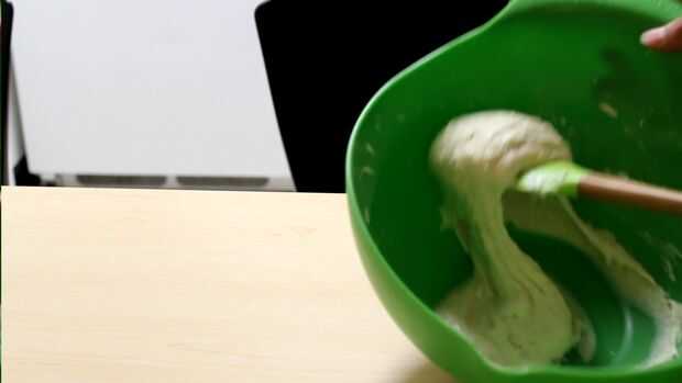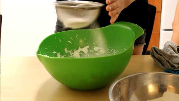 Tamizar la mezcla de ingredientes secos a la mezcla de huevo batido y doblar suavemente hasta obtener una textura de lava fundida. La mezcla debe bien la cinta y lentamente fluir nuevamente dentro de la forma del tazón de fuente, pero no debe ser demasiado líquida (ver mis otros videos para más ejemplos).