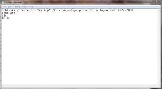Schtasks /Create /tn "My App" /tr c:\apps\myapp.exe /sc onlogon SD 27/12/2050