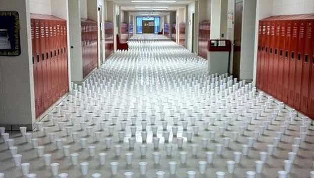 OK, lo admito. Esto es bastante difícil, pero vale la pena. Llenar cientos de tazas de agua y velocidad alrededor del piso de oficina o escuela. Esto puede tardar a muchas personas muchas horas.