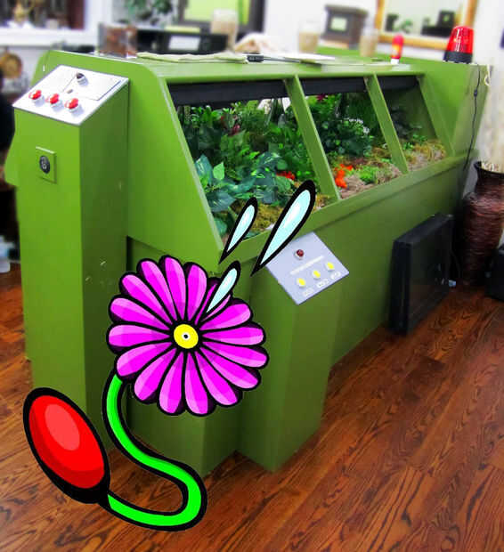 Hi peeps! Tina y yo recientemente nos pidió que construir una versión gigante de la antigua hilarante chorros flor broma, salvo que éste sería interactivo y limo del aerosol. Necesitábamos las víctimas a acercarse a la máquina (que parece un terrario grande) así que incluido un montón de botones que les traería lo suficientemente cerca como para les broma. En total necesitamos la máquina tiene tres conjuntos de botones que caerían "planta alimentos" sobre las plantas, regar las plantas y encender y apagar luces. También se necesitan altavoces ampliar blast un sonido de alarma y es necesario tener bulbos de las plantas y luego explotar con limo, más necesitan limo algunos cañones escondidas que estallan una gran cantidad de "Baba de la planta" en cue.