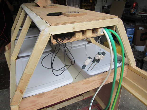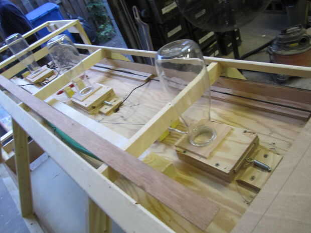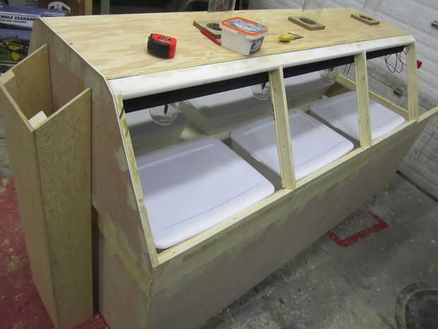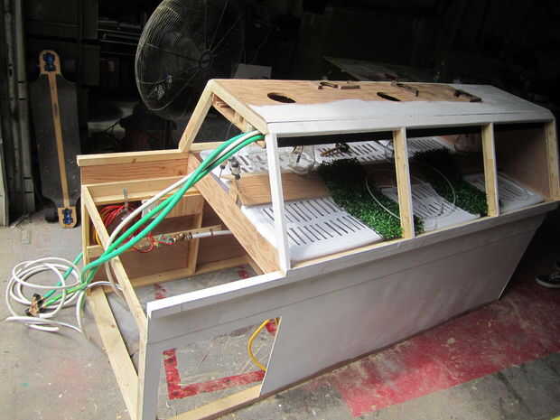 A continuación nos pusimos a pensar en restablecer la plataforma y cómo hacer sea más fácil para el operador. Porque allí iba a ser un montón de agua y limo involucrados hemos decidido hacer un sumidero de contenedores Rubbermaid (que corte aberturas en las tapas para que drenaría el agua en las cajas). Plantas falsas se sentarían en el musgo que se sentaría en una toalla que se sentaría en los contenedores.