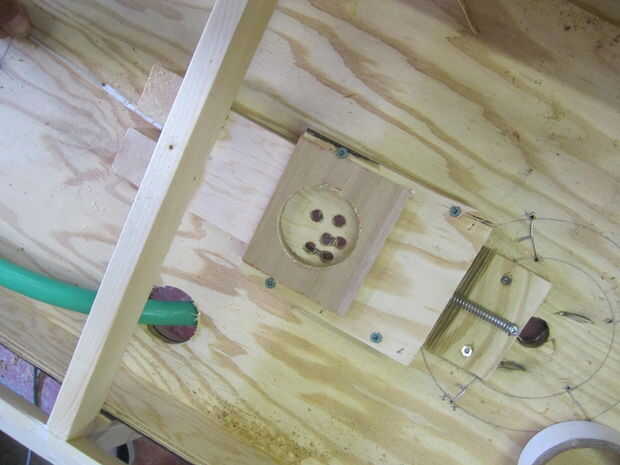 A continuación hemos decidido abordar el botón de agua. Esto se convirtió en una serie un poco complicada de líneas de manguera de un colector con válvulas; Cuando presiona el botón de agua nos suelte la válvula apropiada y salpicaduras de agua hacia fuera de un aspersor de jardín de techo.