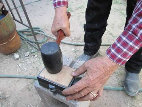 Con dos de mis placas de presión de madera iniciadas en la Cope y de arrastre, proceder a la fuerza a las placas de presión en el uso de un mazo de goma grande.  Es importante utilizar ataques lisos, cuadrados que usan el rostro completo de la maza para que las placas de presión comprimen uniformemente.  Tengo uso madera contrachapada seno frente comercial y arrastre tiene hecho un bisel a las paredes laterales que es más estrecho hacia el centro del molde.  La madera contrachapada puede aplastar a la vanguardia como cuñas en la caja de acero para evitar que sacar.