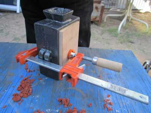 Estamos utilizando un tipo de agarre cerrado de pinzas de crisol que permanecerán conectado a la placa durante el derretimiento. Puesto que el tong es acero que se funde a una temperatura de 800 grados Fahrenheit más alta que la de bronce, sólo tenemos que mantener el mango de madera lo suficientemente lejos del horno.
