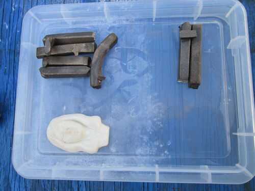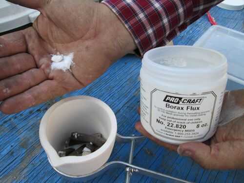 Esto fue colocado en el crisol con una cucharadita o más de fundente el bórax en el fondo del crisol. Esto es sólo el comienzo del bórax ya más se necesitarán una vez que el metal alcanza una temperatura de cerca de derretimiento.