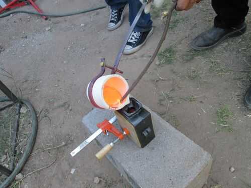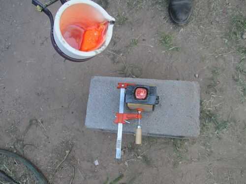 Tras el vertido me completamente llenado del rabos de colada, y hay poco restos de material en el crisol. El material más brillante a la derecha es de bronce fundido y el material más oscuro en la parte inferior es vidrio de bórax del flujo. Derramé el metal en nuestro stand de molde de bloque de hormigón y una capa de vidrio de bórax permanecerá en el crisol para la próxima fusión.