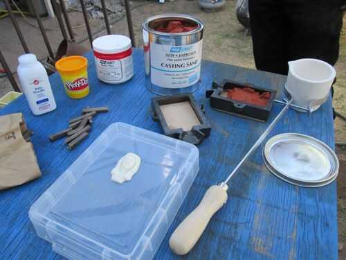de izquierda a derecha tenemos 1. polvo de talco como desmoldante y antiadhesivo, 2. Play-Doh para Esprúe formando, 3. palos de la aleación del bronce (lingotes) como nuestro material de fundición, 4. Fundente de BORAX (tarro con la banda roja, bórax en polvo para la colada de las obras de la tienda de comestibles tan bien.), 5. Arena de fundición lapidaria (esto es arena muy fina con un aglutinante especial que no contiene agua y se puede utilizar inmediatamente) 6. la Cope de dos partes y arrastre moldean para fundición de objetos pequeños, 7. un crisol para fundir los lingotes de bronce y en el centro de la caja de plástico, 8. nuestra impresión 3D.