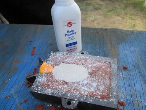 Una vez que la Cope, espolvoreado con talco para crear una capa de liberación del molde para permitir que el molde terminado para ser separados cuando estamos listos para sacar el patrón.  Esta aplicación es un poco irregular y una capa fina hubiera sido mejor.