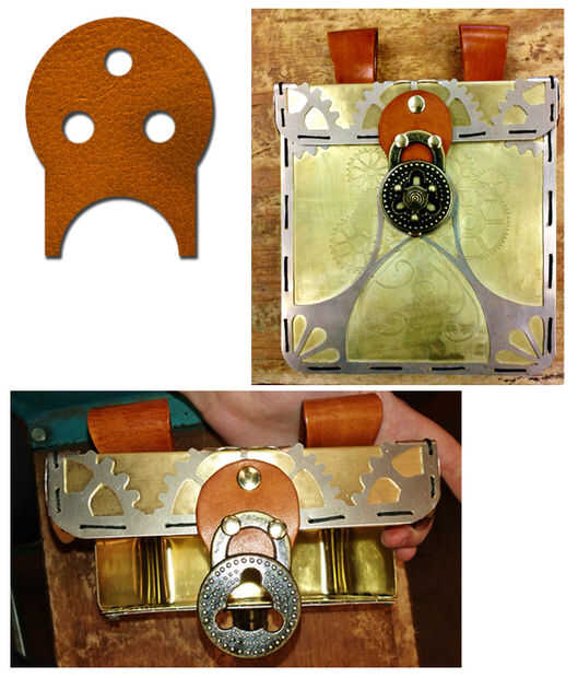 ¿Así, ya ha unido su cerradura inferior a la placa frontal, derecha? Ahora tenemos que medir cuánto cuero necesitaremos para que las cerraduras satisfacer. Patrón y plan! Tiene que ser casi perfecta, no es muy indulgente, si está apagado. Aquí es un patrón de ejemplo de la pieza de cuero que usa. Cortar el cuero, agujeros, terminar los bordes, tinte y sello. Entonces clava la cerradura superior a la piel y el cuero en la tapa. Vas a tener que taladrar un orificio en la tapa por supuesto para esto, pero usted puede hacer esto después de que esté afinando con las aletas y pieza decorativa en la tapa.