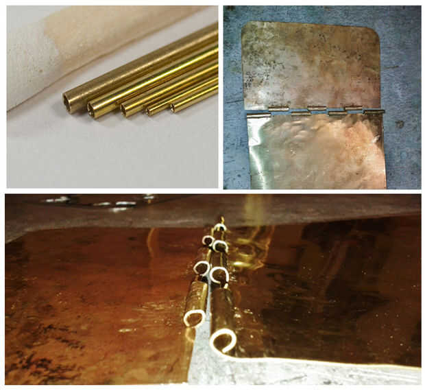 No tienes que cortar el tubo para encajar perfectamente en este momento. Te sugiero dejar una pulgada en cada lado. Ponga la tapa y placa trasera juntos y trabajar el tubo en él. Esto puede ser difícil, pero afinando ligeramente con pinzas puede ayudar. Si el tubo es muy fino, puede cortar las lengüetas más cortas de 1/2 una pulgada, como usted no necesita mucho para rizar alrededor del tubo. Esto es complicado, y si usted planea hacer una bisagra, hacer el patrón después de patrón con papel y asegúrese de que sus medidas son perfectas!