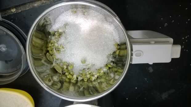 • Tomar un vaso de coles, 1/4 vaso azúcar y cardamomo 2 en una mesa de mezclas.