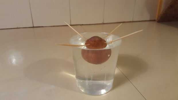 Pinchar los Mondadientes en la semilla y suspender la parte inferior de la mitad de la semilla en un vaso de agua.