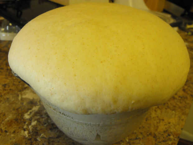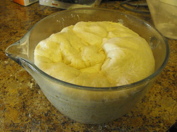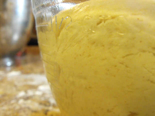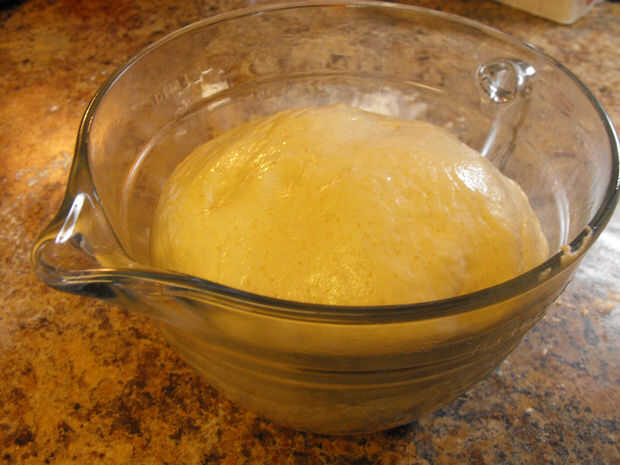 Coloca la masa en un bol ligeramente aceitado y gire a la capa con aceite. Utilizar un recipiente de Pyrex con el volumen marcado en él que puedo hacer un seguimiento de cuánto ha aumentado.  Cubrir con un paño húmedo y deje reposar en un lugar cálido hasta que doble su volumen, aproximadamente 1 hora.