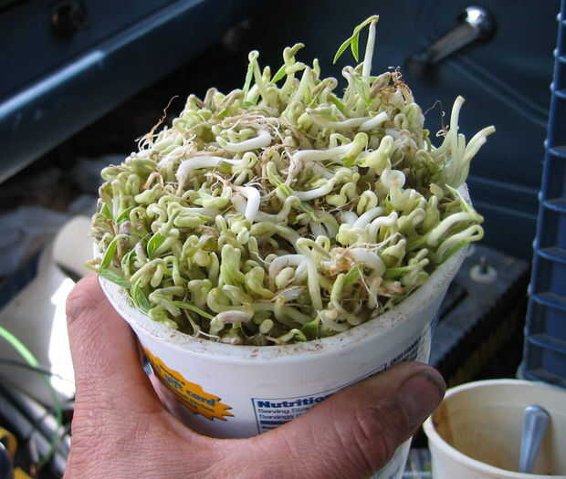 Aquí es un jarfull de mung que brotaron en la cabina de mi camión, manejando al sur, camping y construir mi canoa va a Cuba en el camino. Algunos brotes se cultivan mejor en la oscuridad. Cuando se expone a la luz empiezan a hacer hojas de color verde. Estas son finas.