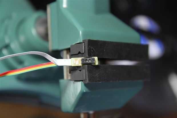 La segunda imagen muestra el sensor real. Es un simple emisor de infrarrojos y un receptor. Cuando el negro del papel no refleja y hace que el receptor abierto - desconectar el circuito. Cuando la página es blanca rebota muy bien y se cierra completando el circuito.