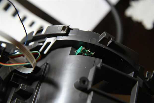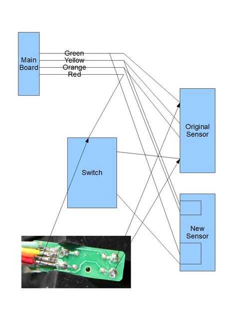 Cableado para arriba es fácil. En uno de los polos externos cable un solo plomo del nuevo sensor. La sección media del poste del alambre el alambre principal (donde se conecta a la placa principal). El último poste de alambre el sensor original aquí (uno que se cortó en la carcasa superior).
