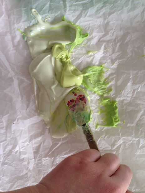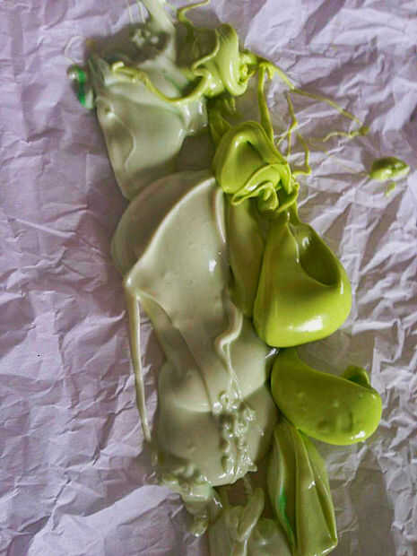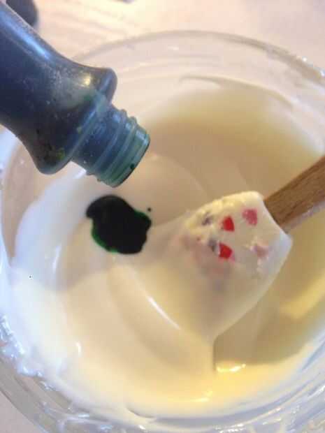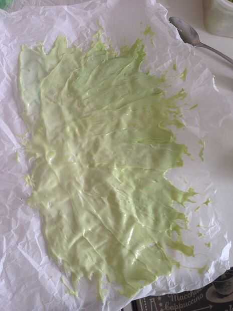 -Agregar el colorante {obras de neón verde mejor} en pequeñas cantidades y a partir de sólo un color-verde, línea de chocolate en el centro del papel. Añadir un poco más de color, luego agregue un poco de que junto al chocolate blancuzco en el papel. Continuar hasta la más oscura sombra que desee y utiliza todo el chocolate.
