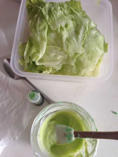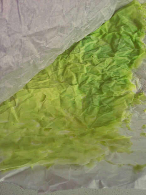 -Coloque una hoja grande de papel de pergamino {papel encerado probablemente trabajaría también, sería menos robusto} y asegúrese de que hay un montón de arrugas en él. Son lo que hace la lechuga ver cómo hay.
