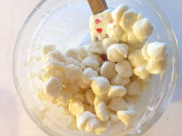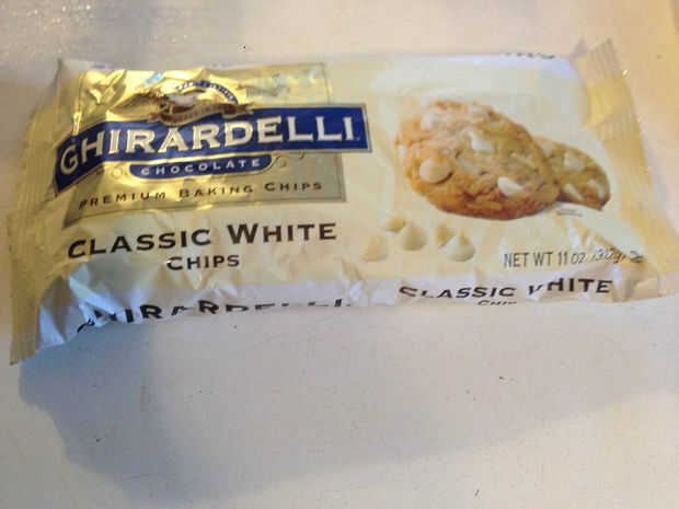-Fundir el chocolate blanco {utilicé sobre media taza de como cuatro hamburguesas} en el microondas en intervalos de 30 segundos, revolviendo en el medio.