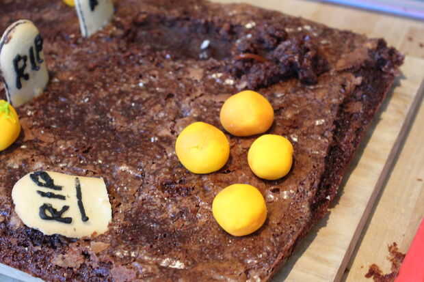 También usé una cuchara para sacar lo que iba a ser una tumba vacía con el brownie de exavated en una pila en el lado con cola de encaje desparasita