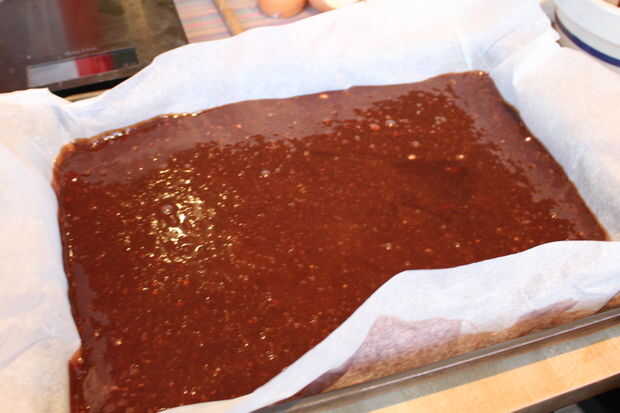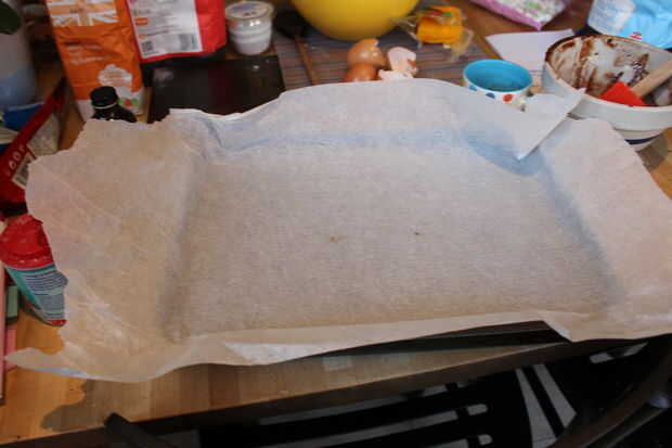 Consigue una lata plana grande alrededor de 2cm de alto y 24cm de ancho y 34cm de largo, aunque este es el tamaño utiliza lo pueden usar casi cualquier lata plana. Cubrir la bandeja con papel impermeable a la grasa y vierta la mezcla en el molde y hornear en el horno a 180 grados c durante por lo menos 25 minutos pero probablemente 30 min cuando lo lleves a cabo estará ligeramente suave pero parece esponjosa en el exterior.