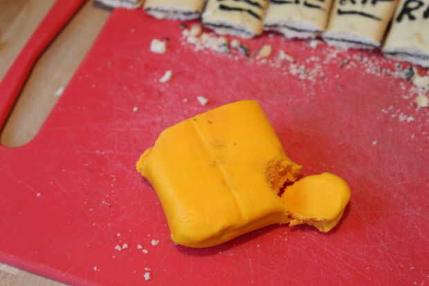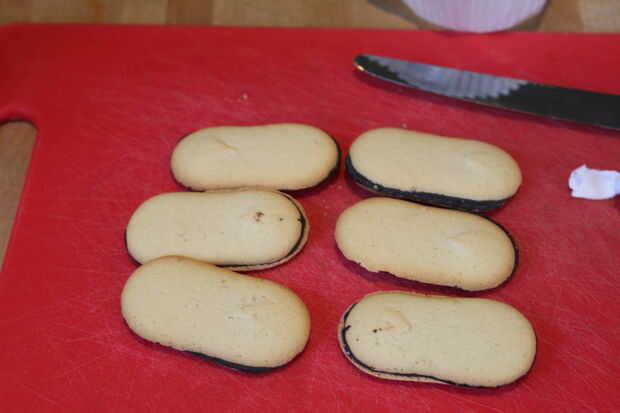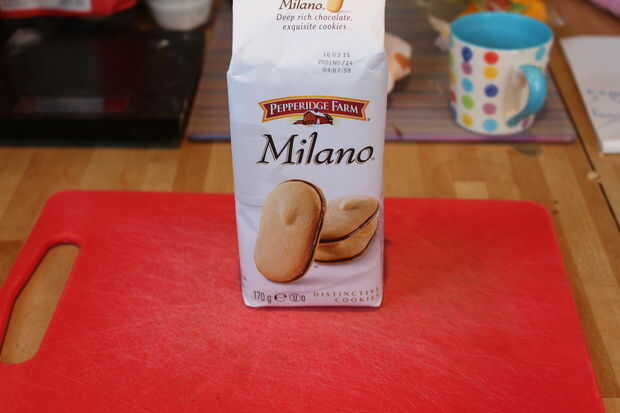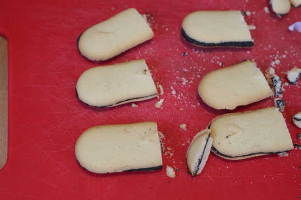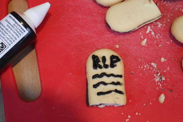 Para los gravestones usé estas cosas Milano chocolate pero cualquier cookies en forma oval-ish. En primer lugar cortar un extremo en mi opinión cuando cortó una diagonal pequeño parecía mejor. Simplemente utiliza algunas tienda comprado escritura guinda y escribió la tradicional 'RIP'