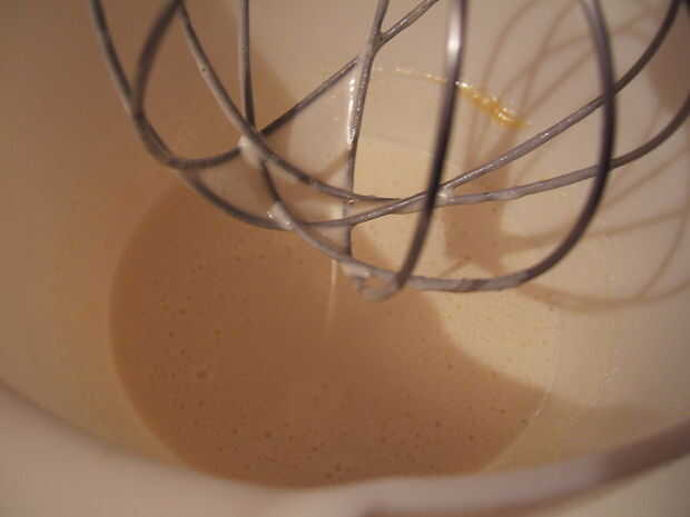 Una vez hecho esto, agregar el polvo de hornear a la harina y batir en los huevos y el azúcar. Omita el polvo de hornear si usas harina self-raising.