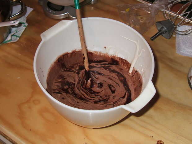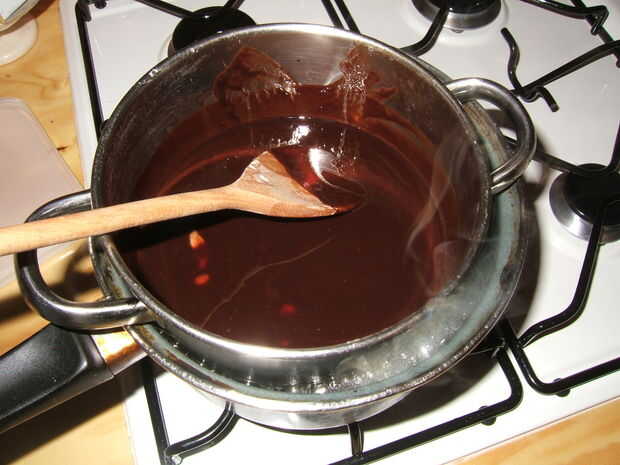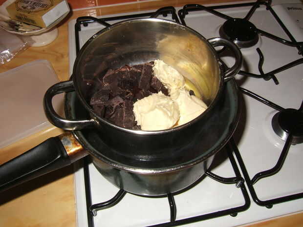 Poner el chocolate y la margarina en un cazo o cuenco y ponlo dentro del recipiente grande de agua, que debe estar caliente por ahora. El fondo de la cacerola pequeña sólo puede tocar el agua, no tiene que ser sumergido. Haciéndolo de esta manera el chocolate funde rápidamente pero sin la quema como lo hace normalmente si intenta fundir directamente en la llama.