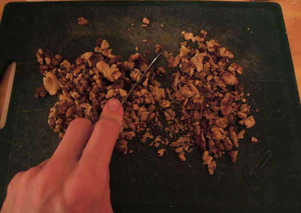 Aproximadamente picar las nueces y revuelva en la mezcla así. Omita este paso si quieres.