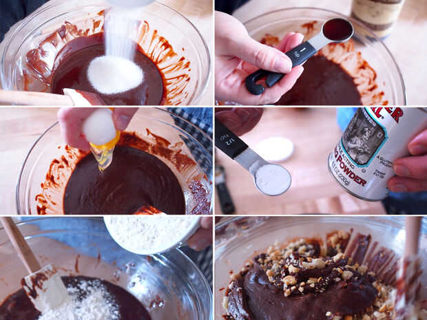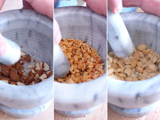 2. Mientras el chocolate se derretía aplastar las tuercas. Utilicé un mortero y una maja, pero cualquier método para machacar tuercas funcionará.