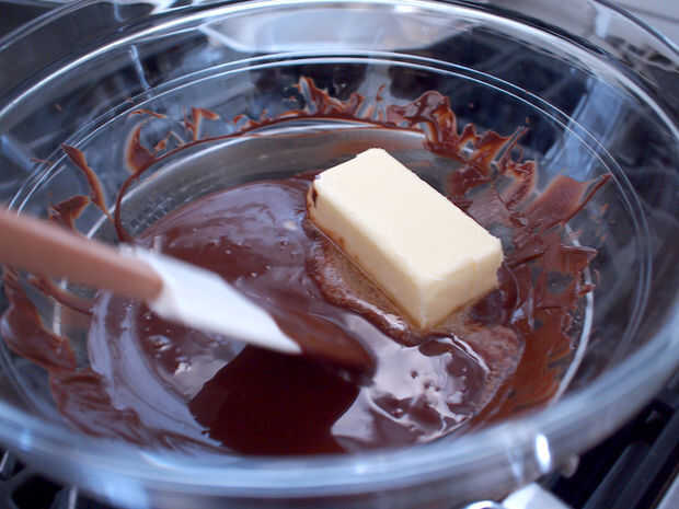 3. Cuando el chocolate se haya derretido retirar del fuego y añadir la mantequilla, mezclar hasta combinar.
