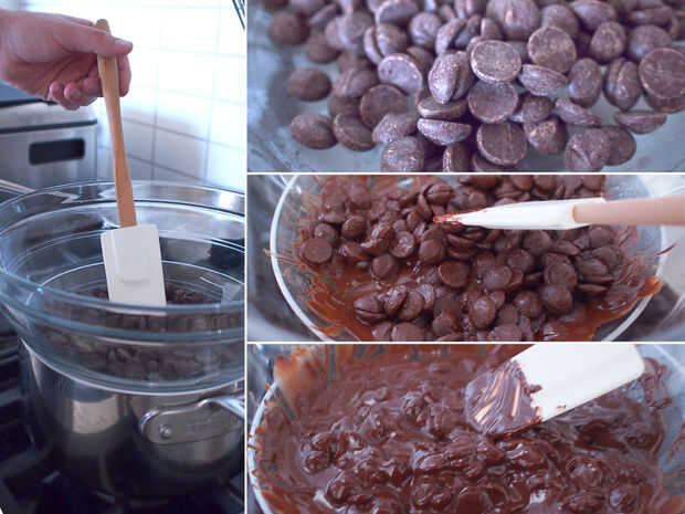 1. En un bain marie (baño María) a fuego bajo derretir lentamente las virutas del chocolate, revolviendo ocasionalmente.