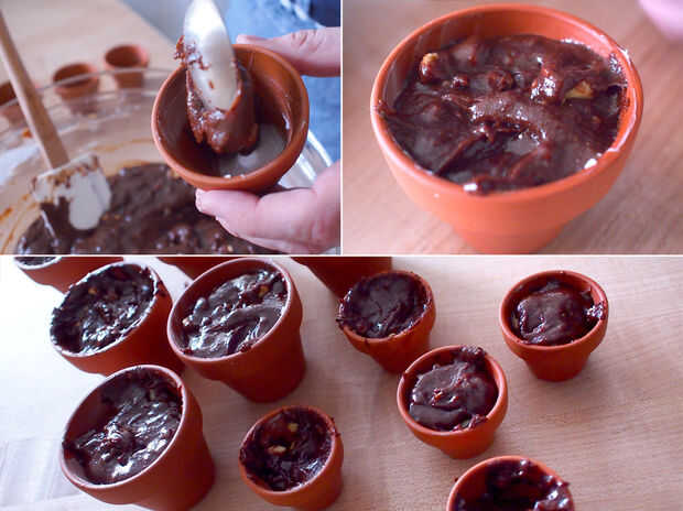 Cuando todos ollas están llenas puede sacar la masa de brownie en cada uno, permitiendo un margen en la parte superior de todos los potes de expansión cuando se hornea.